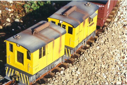 The following photos show the units on the line following their completion in the early 2000's. A six wire MU cable connects the two. The -2 carries a 14.4 volt nicad battery pack, theLocolinc receiver is in the -1 unit. Both units have working headlights on the engineers end and they are directional.