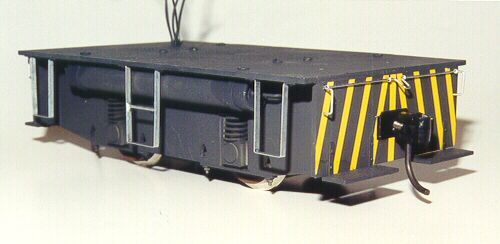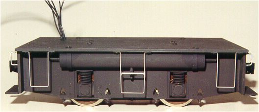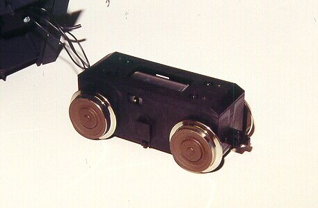 This photo shows the USA power truck. The only modification I made to it was to cut off the axle stubs, remove thetrack pickup sliders and drill and tap four holes in the top cover to mount the frame.