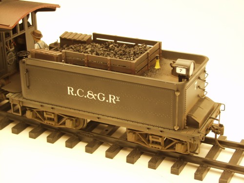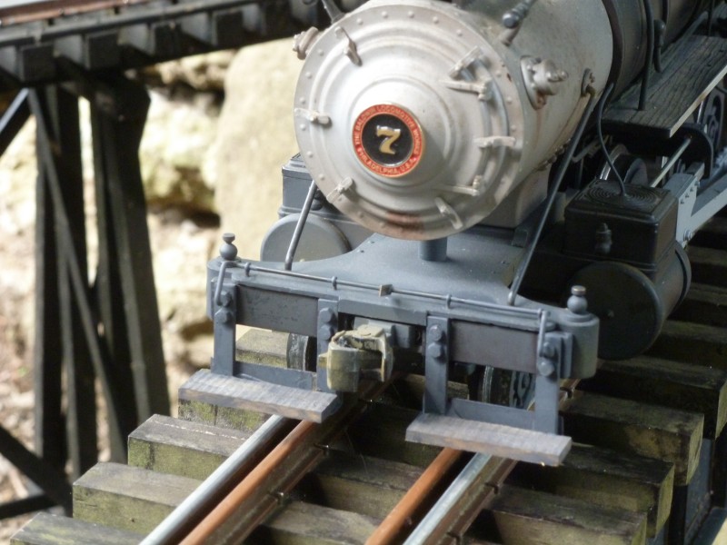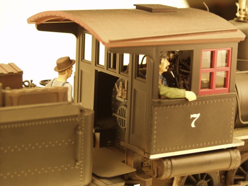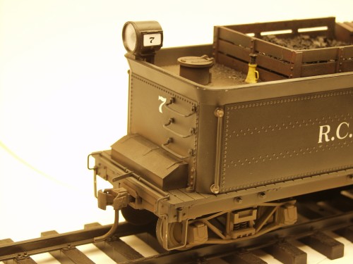4. Replaced the dual air pumps with a single brass cast unit, replaced the whistle and pop valves with Ozark parts, added air tanks under the cab and replaced the air tank mounted on the tender with a tool box, modified the headlight to remove the angled number boards, added smokebox cleanouts (Ozark) added smokebox dogs to front of smokebox and replaced the number plate with a tie tack sold by the Friends of the EBT. A cab vent hatch was added to the cab roof as well as some rain deflectors to the cab roof lower edges.Inside the cab I added a throttle, lubricant shelf over the firebox door and injectors. The tender also got some grab irons on the back of the tank and stirrups on the back beam to allow the fireman access to the water hatch without climbing over the coal load, uncoupling levers and a backup light was added as well.