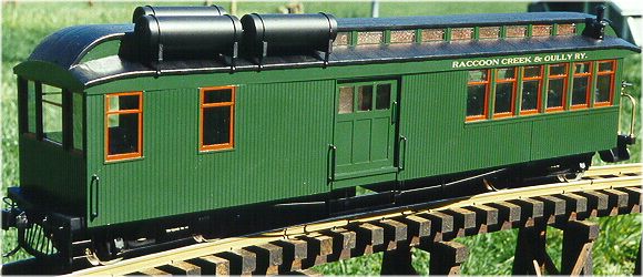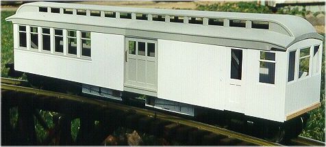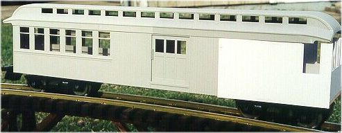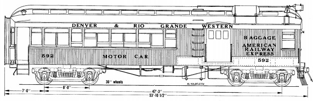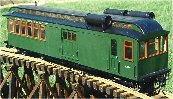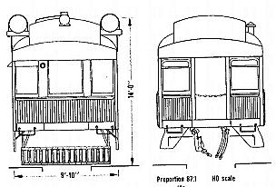 The prototype began life as as 52' wood day coach built by Pullman in 1898. In 1920 it was overhauled to become a baggage-coach combine. In 1927 it was converted into a piece of motive power with the installation of two 104 hp Continental 6 cylinder engines. In 1930 it was taken out of service and in 1938 the engines were removed and the car was used as a combine until 1951. The photos and plans for this car came from the May 1968 addition of Model Railroader. Drawings follow...