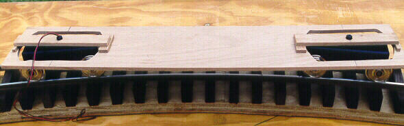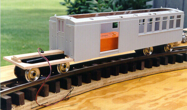 At the time of this portion of the construction I was using gel cell battery packs and this photo show one in the baggage section, note only one truck will be powered.