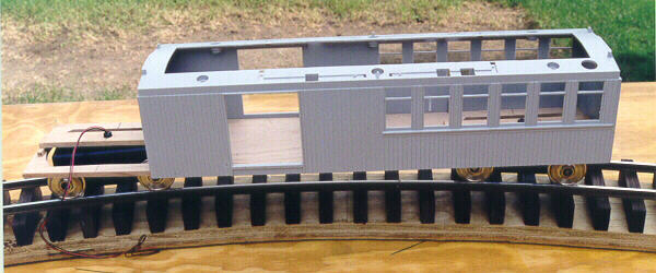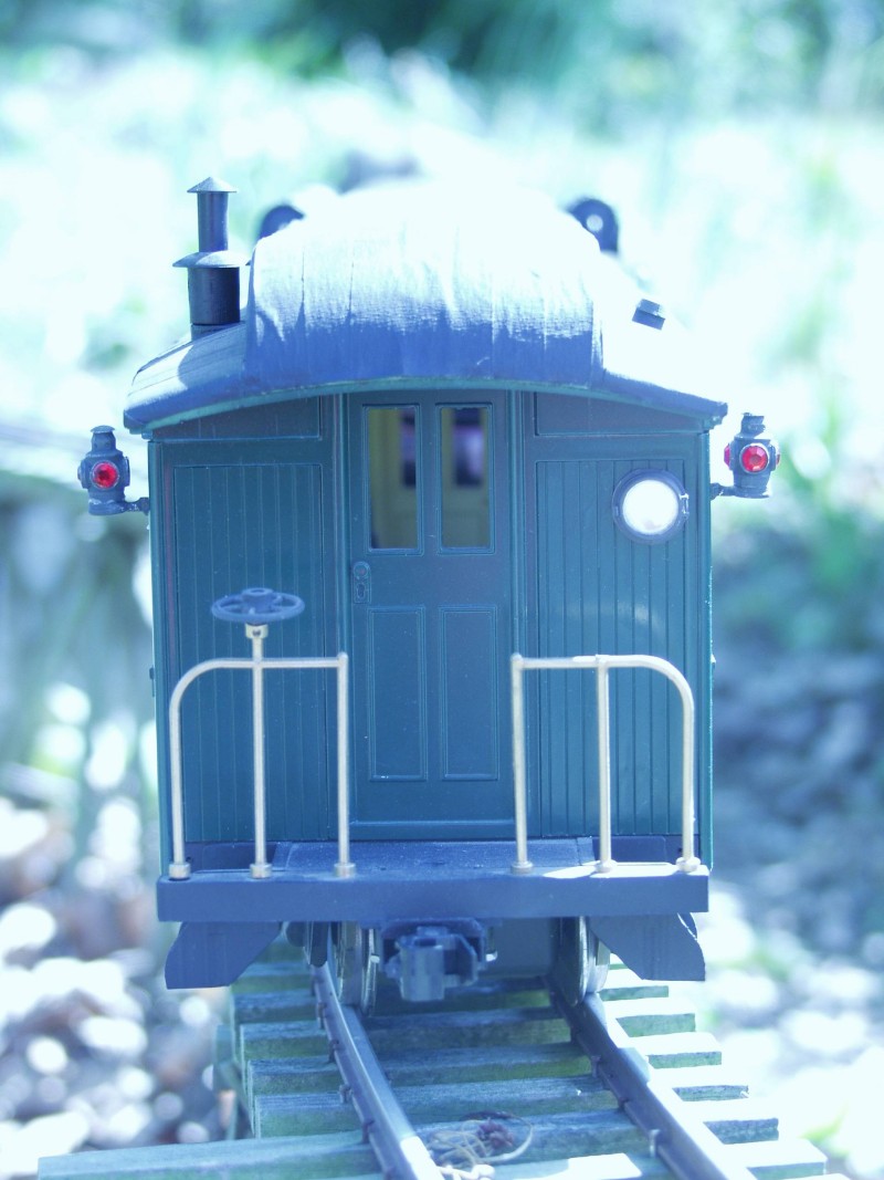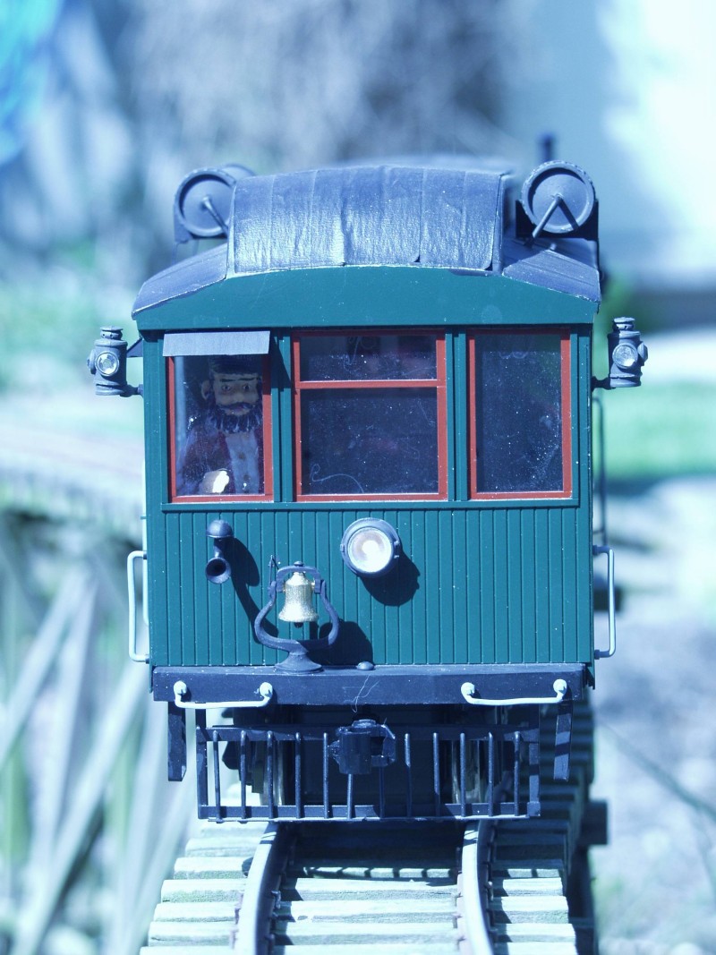 OK, fast forward ten years. Once the M-3 was running the priority to finish detailing dropped to nearly zero. After about five years the battery pack I had originally used ceased taking a charge and the M-3 became a shelf decoration. Finally in 2014 I decided to put in a new pack and while I had it apart decided to finish it up. New items include, new smaller tanks on the roof. Something didn't look right with the originals and it turned out I had scaled them off of the prototype plans which made them too large for narrow gauge. Since it was originally built I had also changed the couplers, I was using from the "G" size and these were changed to the gauge one size. The cab area got a bell, air horn, a headlight and sun visors for the motorman's windows and marker lamps. I replaced the handrails next to the motormans door and the baggage doors and added grab irons for access to the roof. A backup light and rear marker lamps were added as well as a few patrons in the passenger section and a motorman to drive the thing. The original Locolinc receiver was replaced with Revo unit I used a 12 cell sub 'C' size pack of nicads to replace the original gel cell. The drive truck was disassembled and lubricated. The final results are shown below.